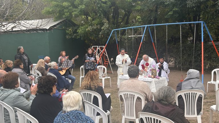 En la tarde de hoy, la Parroquia Nuestra Señora del Perpetuo Socorro de Mina Clavero celebró una emotiva misa comunitaria en la Plaza de los Niños, ubicada frente a la sede de CLEMiC, con el propósito de rezar por las cooperativas de luz y agua, y por la paz del mundo.