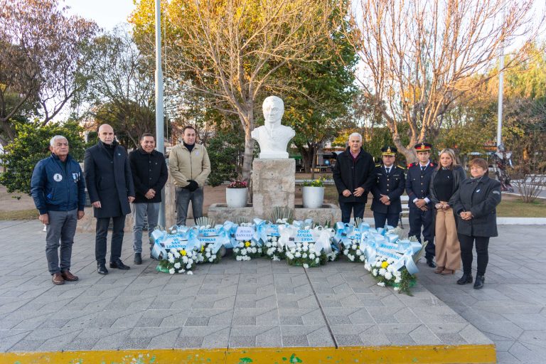 Como parte de la ceremonia, la presidenta y la síndica realizaron, junto a otras autoridades, la colocación de un arreglo floral frente al busto del General San Martín ubicado en la Plaza Centenario, homenajeando la memoria de los héroes de la patria.