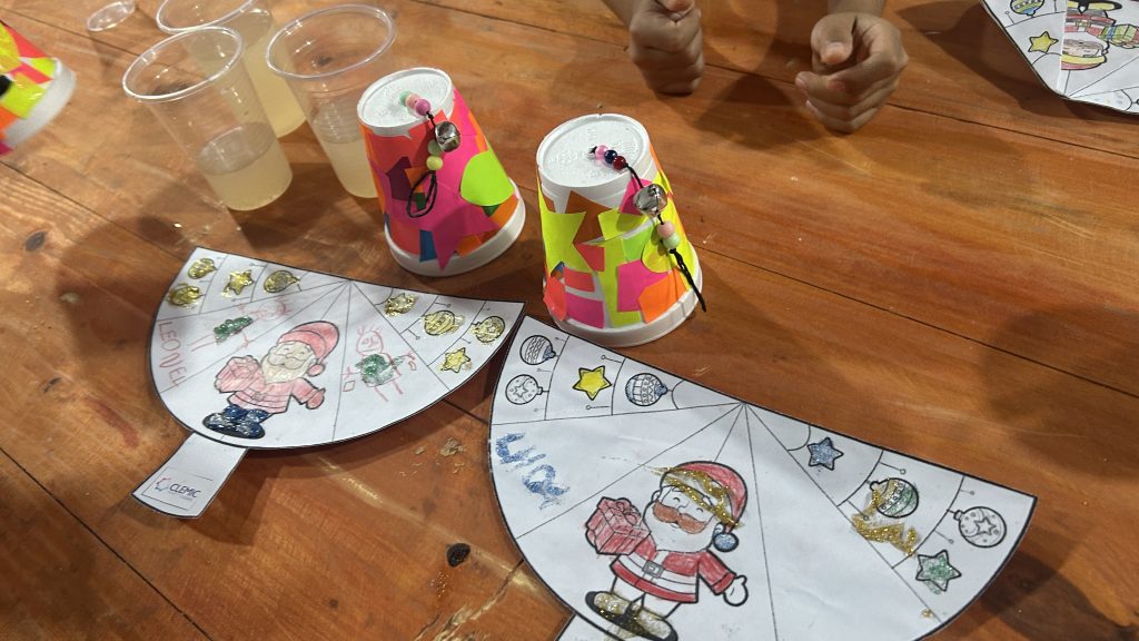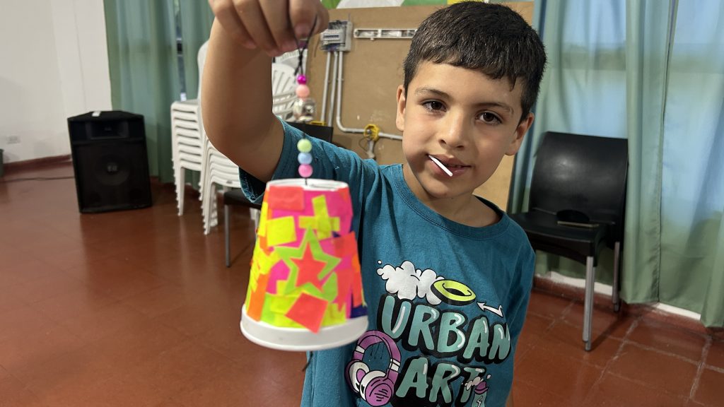 Acompañados por las consejeras Mabel Alaye, Silvana “Loli” Depetris y por la docente a cargo, Melisa Cortes —una seño carismática que rápidamente se ganó la atención y simpatía de todos— los niños construyeron una campanita navideña utilizando materiales simples: un vaso de tergopol, hilo, papel de colores, un cascabel y elementos decorativos.