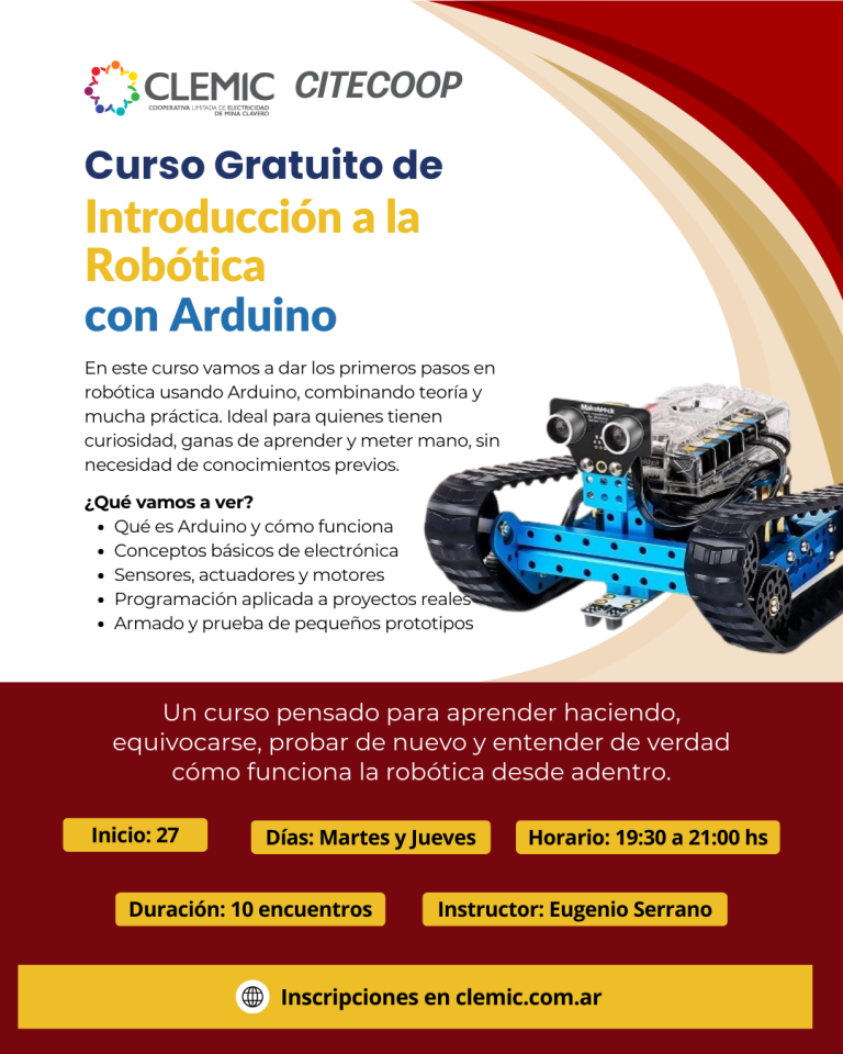 Desde CITECOOP – CLEMiC impulsamos propuestas de formación que acercan el conocimiento tecnológico a la comunidad. En este marco, se lanza nuestro PRIMER curso gratuito Introducción a la Robótica con Arduino, una capacitación pensada para quienes sienten curiosidad por la robótica, la electrónica y el funcionamiento de los dispositivos inteligentes que forman parte de nuestra vida cotidiana.
