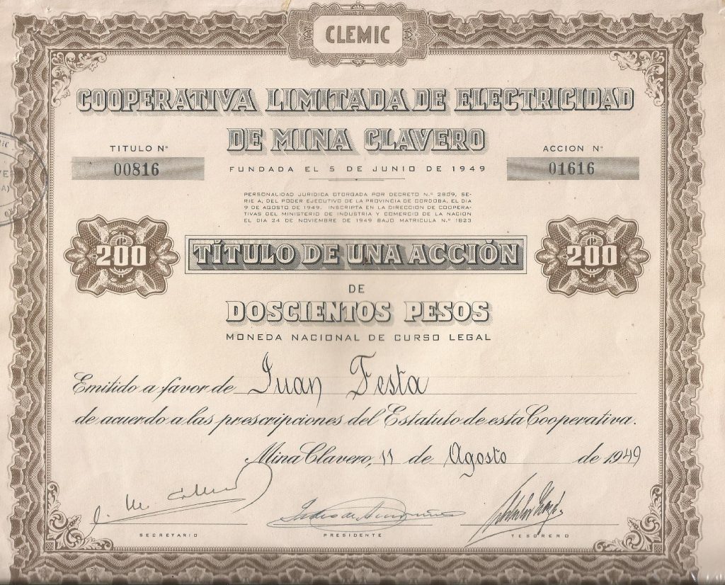 N. de la R.: Las acciones son partes en las que se divide el capital de una empresa, y al comprar una o más, el adquirente se convierte en propietario de una fracción, es decir, pasa a ser un socio en donde se le permite, de acuerdo a los estatutos de la misma, a participar en la toma de decisiones a través del voto en las asambleas. Podemos ver a continuación el Título de una Acción del Año 1949, con la firma del Presidente de la Cooperativa Sr. Pedro M. de Amorrortu, el Sr. Secretario, Dr. Carlos M. Carena y del Tesorero, Sr. Abdala Zazú.