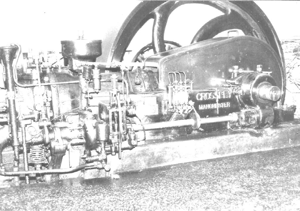 N. de la R.: De acuerdo a la información documentada, en ese momento en la Usina existían 5 motores con generador: el Nº 1 Crossley H.D.S. 10, el Nº 2 Crossley H.D.S. 11, el Nº 3 Motor de Gas Pobre, el Nº 4 International y el Nº 5 Otto Deutz. En la foto siguiente, uno de los Motores Crossley.