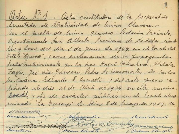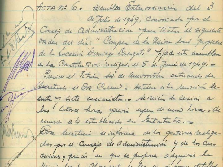 N. de la R: La Primer Asamblea Extraordinaria de la Historia de la Cooperativa se había realizado el día Domingo 3 de Julio de 1949 a las 13 horas cuya Orden del Dia fue tratar la Adquisición de la Usina, local y propiedad de la Sucesión del Sr. Domingo Lorenzato. La asamblea contó con la presencia de 67 socios, y donde se decidió unánimemente la compra de la misma firmándose a posteriori el boleto compraventa respectivo. Foto: Parte del Acta donde consta dicha Asamblea Extraordinaria