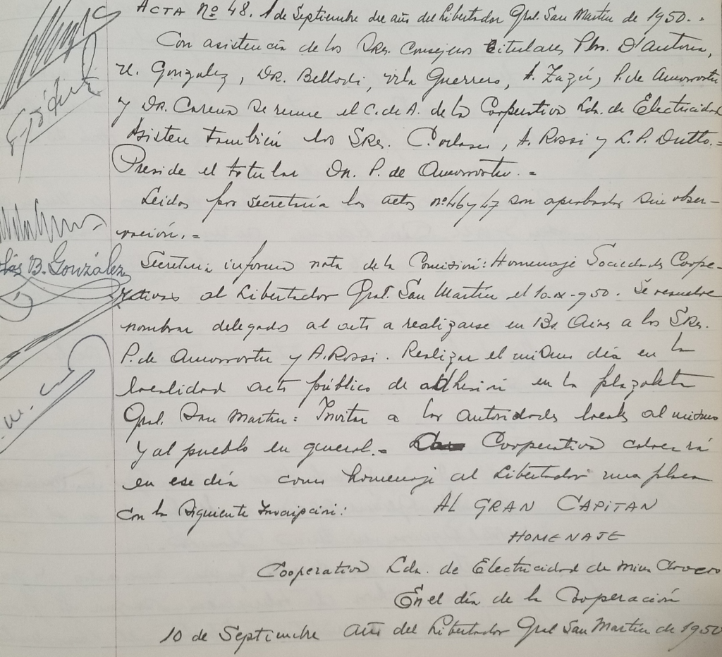 También el día Domingo 10 de Setiembre de 1950, fueron invitados a un acto de homenaje a la memoria del General José de San Martín, con motivo de cumplirse el primer centenario de su paso a la inmortalidad, por la “Comisión de Homenaje de las Sociedades Cooperativas al Libertador General José de San Martín”, a concurrir a la Plaza Grand Bourg, de la ciudad de Buenos Aires, al cual fueron especialmente designados por esta Cooperativa, los señores Presidente Pedro M. de Amorrortu y el Síndico Suplente Sr. Adolfo Rossi, adhiriéndose al solemne acto de homenaje de todas las Cooperativas del país a la memoria del Libertador.