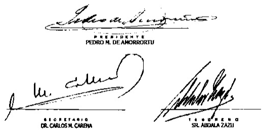 N. de la R.: El Presidente era el representante legal de la Cooperativa; su liderazgo era trascendental. Debía firmar toda la documentación legal en conjunto con el Secretario y el Tesorero, las acciones y todas las obligaciones inherentes a la administración (Art. 46 del Primer Estatuto Social de la Cooperativa) y con esa responsabilidad que sabían que tenían a su cargo, como personas de valores leales y respetuosas, aprobaron por unanimidad de que lo que se trataba en las Reuniones del Consejo de Administración, debía mantenerse en la más estricta reserva dentro de sus miembros. Foto: Primeras firmas del presidente, secretario y tesorero de la Cooperativa, Sres Pedro M. de Amorrortu, Dr. Carlos M. Carena y Sr. Abdala Zazú, respectivamente.