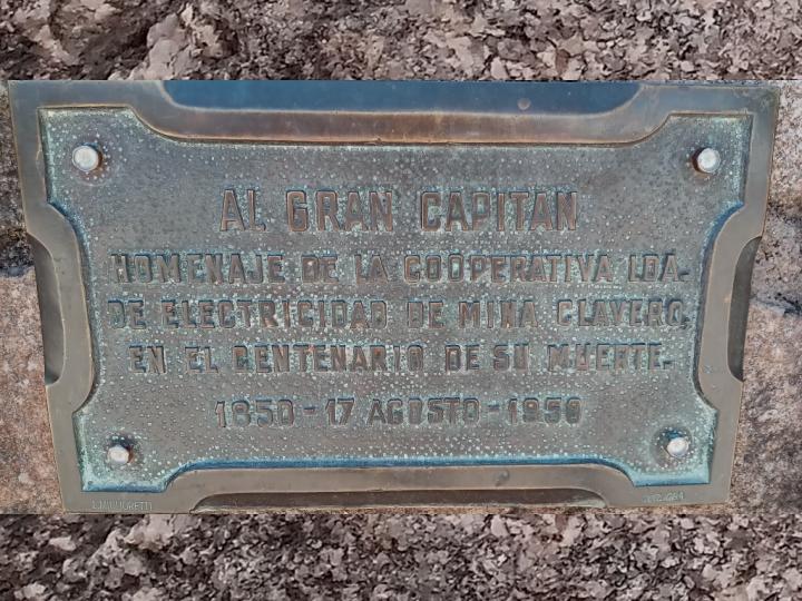 Posteriormente, el día Domingo 17 de Diciembre de 1950, pudo ser colocada sobre el pedestal que sustenta el busto del héroe de la independencia, la placa aludida con la inscripción: “Al Gran Capitán – Homenaje de la Cooperativa Limitada de Electricidad de Mina Clavero – En el centenario de su muerte “1850 – 17 de Agosto – 1950” .