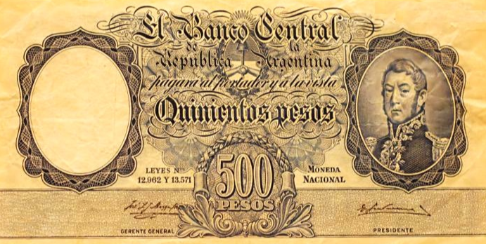 N. de la R: Los datos comparativos a la fecha no tienen relación directa con la realidad actual (2025) ya que si verificamos, según el transcurso de las décadas y de “el informe del dinero en el tiempo”, nos indica que un dólar de 1950 equivaldría en poder adquisitivo al día de hoy a unos 13,52 dólares, un aumento de 12,52 dólares en 75 años, por lo que el dólar tuvo una tasa de inflación para nuestro país de un promedio del 3,53 % anual entre 1950 y la actualidad, lo que generó un aumento acumulado de 1.252,59 % . A esto debemos agregar el trasfondo propio del país, que desde el inicio del gobierno patrio tuvo 5 monedas diferentes (m$n, peso ley, peso argentino, austral y peso) y una tasa inflacionaria monumental, y que por cierto, desde 1970 a la fecha, eliminó 13 ceros a su moneda. Foto: Ilustración de un Billete de 500 pesos moneda nacional (m$n) en 1949