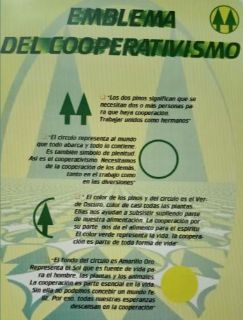 N. de la R.: El emblema del cooperativismo de los dos pinos verdes dentro de un círculo, sobre un fondo amarillo, representa la unión, la inmortalidad y la constancia, y cada figura tiene su significado. Foto: Los dos pinos, su identidad