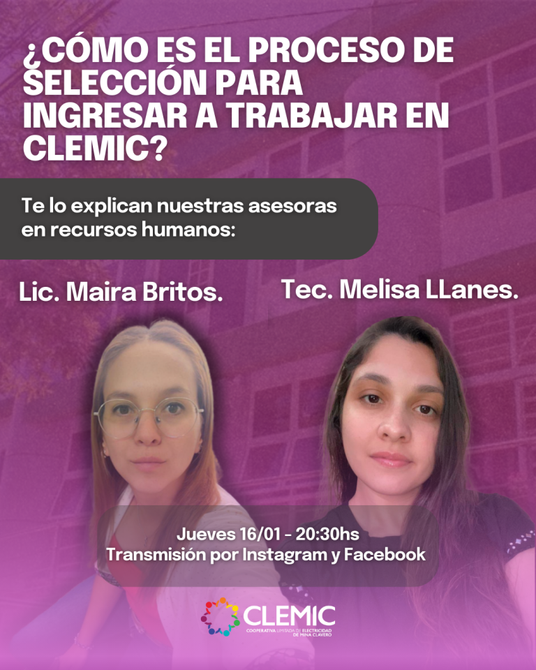 En la noche del jueves 16 de enero, las asesoras en recursos humanos, Lic. Maira Britos y la Tec. Melisa Llanes explicaron en una transmisión por Facebook e Instagram de la cooperativa sobre el proceso de selección cuando hay búsquedas activas.