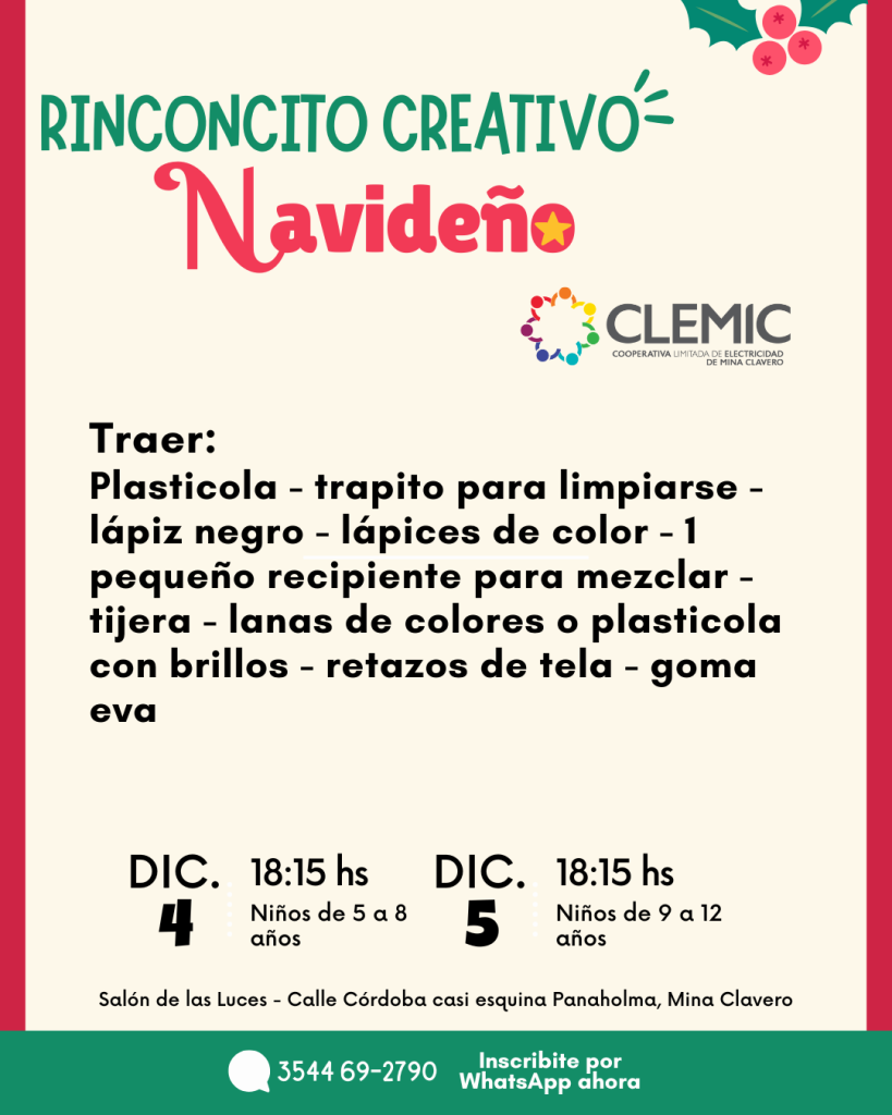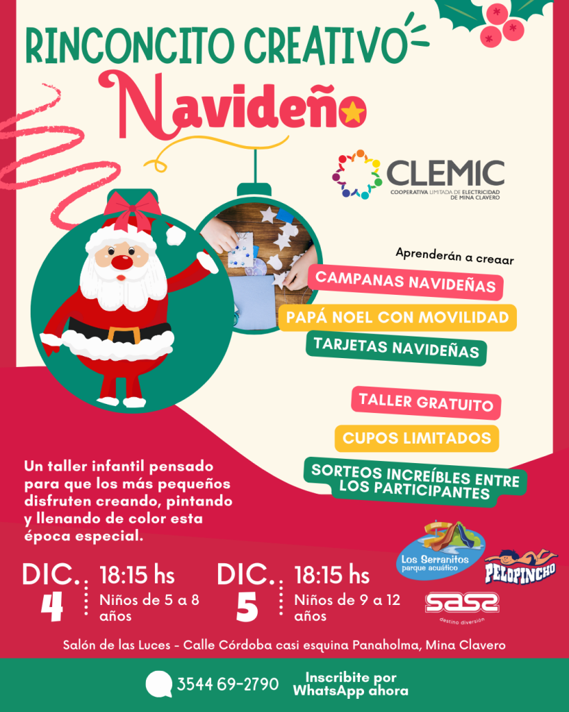 Con la llegada de diciembre, la Cooperativa Limitada de Electricidad de Mina Clavero (CLEMiC) vuelve a abrir sus puertas a un espacio muy especial para las infancias: el Rinconcito Creativo Navideño, un taller artístico pensado para que niñas y niños puedan vivir la magia de la Navidad a través del juego, el color y la imaginación.